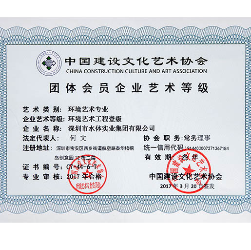 水體集團是噴泉界的先驅(qū),是中國華南地區(qū)具實力的噴泉水景專業(yè)公司,是中國噴泉水景委員會副主任單位、中國環(huán)境藝術(shù)委員會常務(wù)理事單位、深圳市《政務(wù)、商務(wù)決策專家咨詢支持系統(tǒng)》定點服務(wù)單位,具備噴泉水景、水處理、景觀噴灌、噴霧加濕、設(shè)計、施工專業(yè)等級,環(huán)境藝術(shù)企業(yè)藝術(shù)等級總承包類、工程類一級、設(shè)計類甲級,城市及道路照明工程專業(yè)承包三級,等等資質(zhì)。