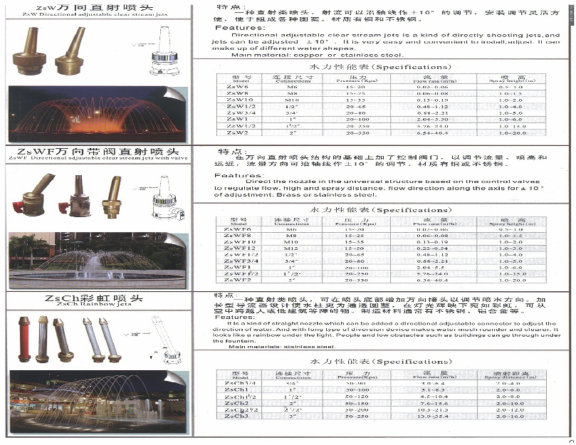 由我公司特殊研制的主噴噴頭等選用不銹鋼制作;噴頭的設(shè)計(jì)是在參照國外公司噴頭技術(shù)的基礎(chǔ)上,在完善的設(shè)計(jì)理論和設(shè)計(jì)依據(jù)指導(dǎo)下,結(jié)合豐富的實(shí)踐經(jīng)驗(yàn)設(shè)計(jì)制作出工藝精細(xì)考究,造型精巧美觀,結(jié)構(gòu)獨(dú)特合理的噴頭,使得噴頭射流平滑穩(wěn)定,噴高相同,所需泵的功率小,節(jié)省能耗約30%;使用壽命長,是普通噴頭的2倍,防止噴頭的堵塞,在水泵進(jìn)水口處設(shè)置了專用的噴泉泵過濾裝置,使得噴頭更加經(jīng)久耐用;滿足CJ/T3050相關(guān)標(biāo)準(zhǔn)。