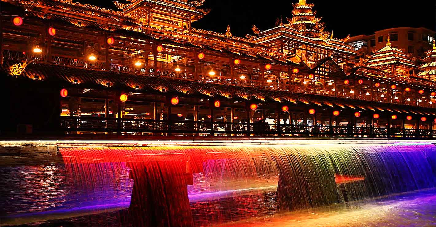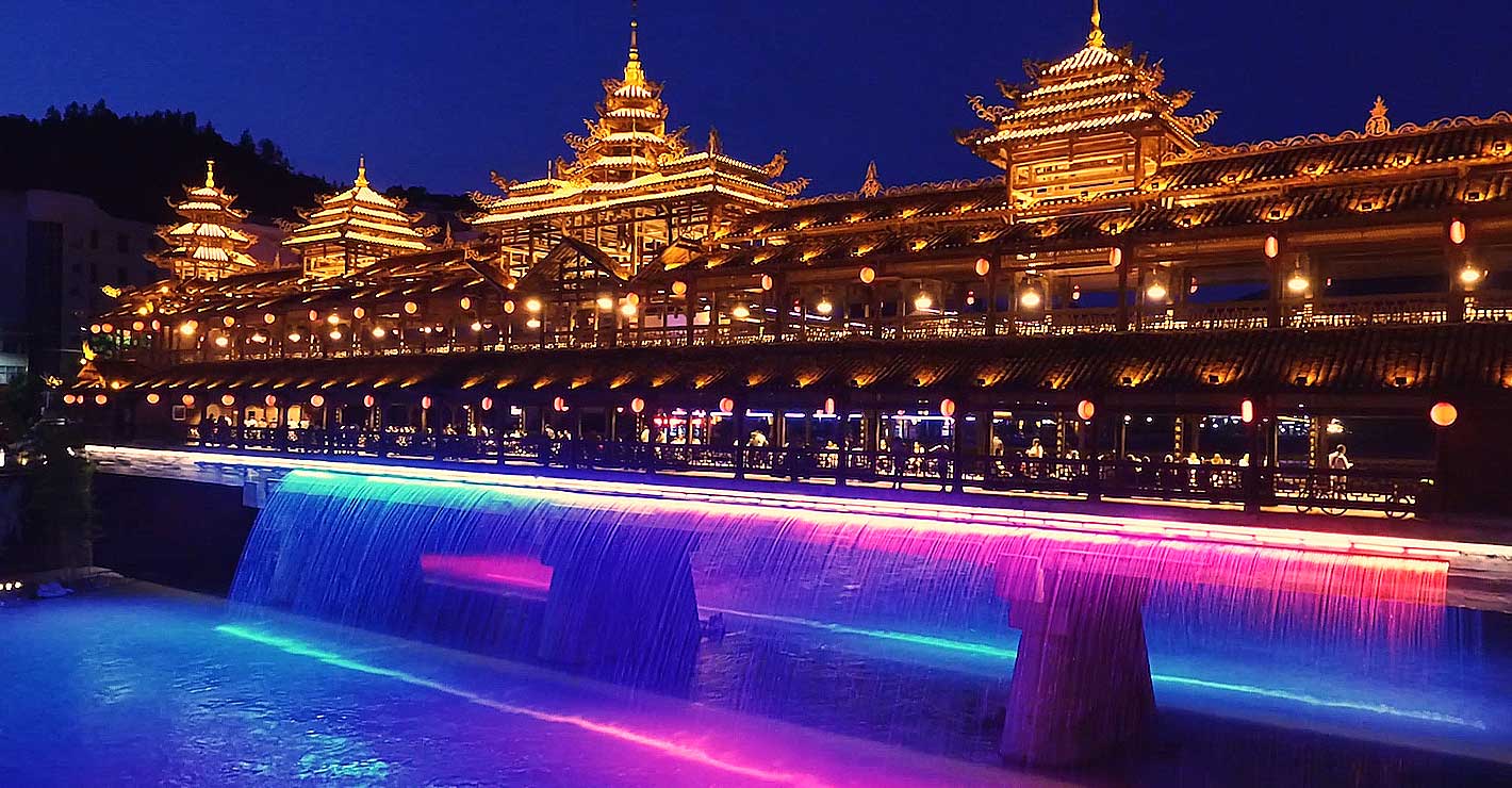 湖北恩施土家族風(fēng)雨橋,此橋已經(jīng)有多年的歷史,是土家族人文化傳承的象征,所以這個項目更加需要成熟、穩(wěn)定的工藝和技術(shù),才能讓這座橋重?zé)ü獠?。在這座橋上,設(shè)計橋瀑布,利用直射細(xì)嘴噴頭與LED數(shù)控?zé)艄芙Y(jié)合,形成一道多彩的瀑布,為此橋增添了一抹色彩。